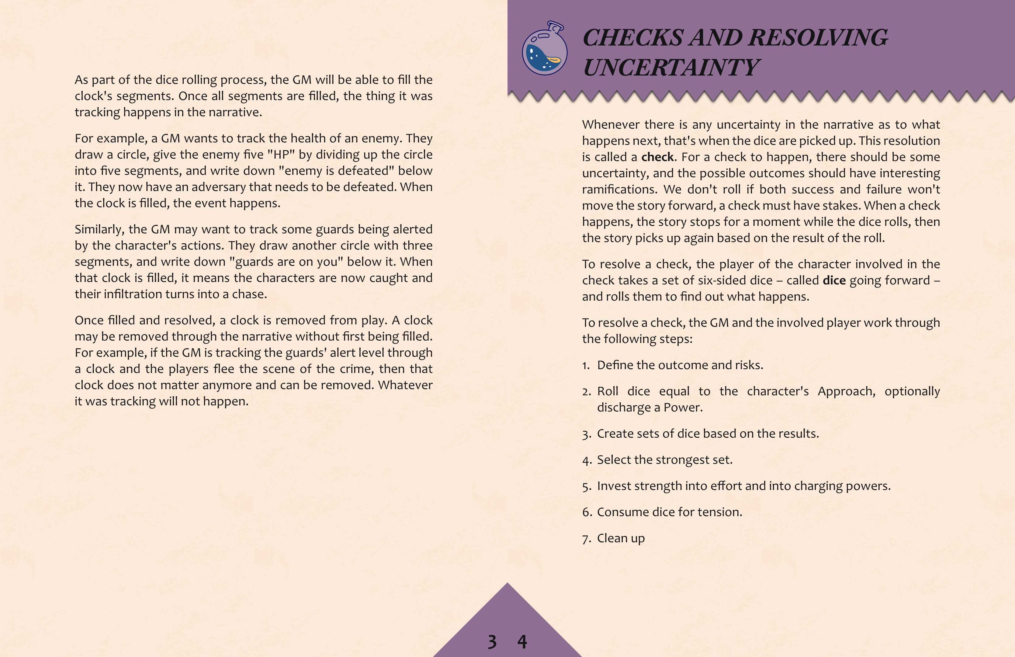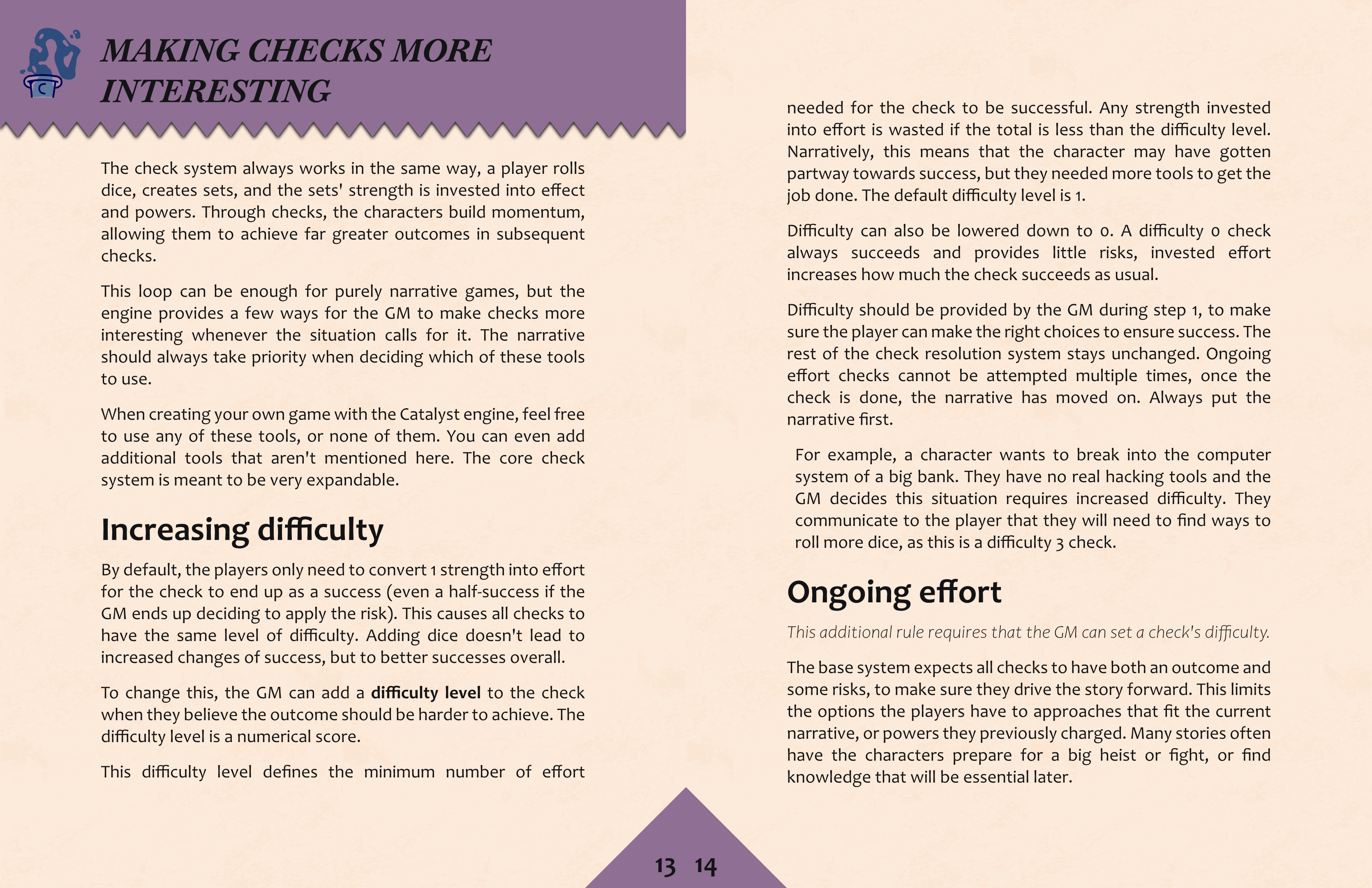 That's the core mechanic of the system, and all that is needed to get started creating content for your game. The Making Checks More Interesting chapter goes into greater details on how to build on that core mechanic to enable the type of narrative you want to create.
